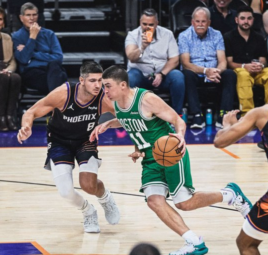 凯尔特人过去3场连赢公牛、勇士与湖人收获3连胜,太阳上一场主场77-92输给开拓者。本场凯尔特人缺少塔图姆与布朗,太阳缺少布克、狄龙、古德温等多位球员。首节开局凯尔特人8-3领先,太阳回敬一波12-2攻势反超5分,凯尔特人逐步以17-24落后。凯尔特人略有反扑追分,首节比赛结束凯尔特人21-26落后太阳。